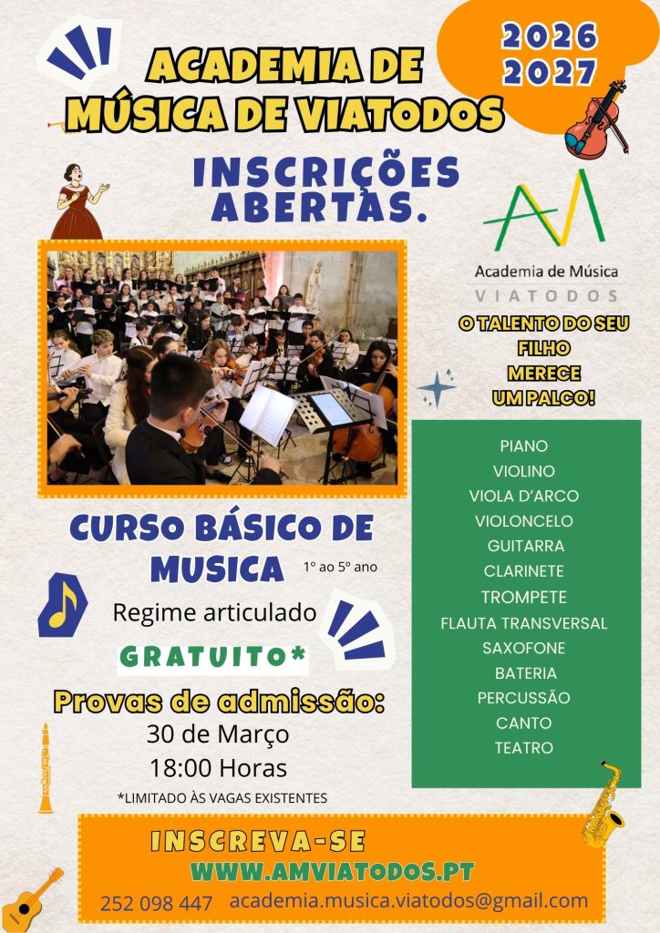 Estão abertas as inscrições para as provas de Seleção ao Curso Básico de Música, em regime articulado, com o Agrupamento de Escolas Vale d’Este para o ano letivo de 2026/2027.